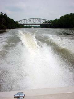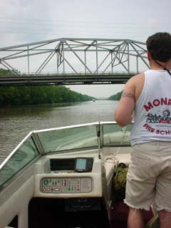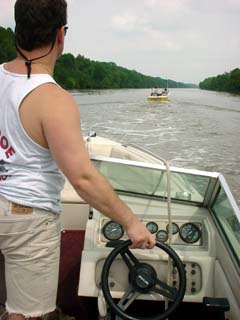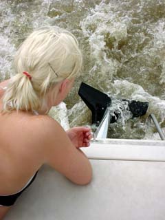 Here's Captain David charting the way down the treacherous waterways while Ang soaks in the sun and gives herself a belly rub. |